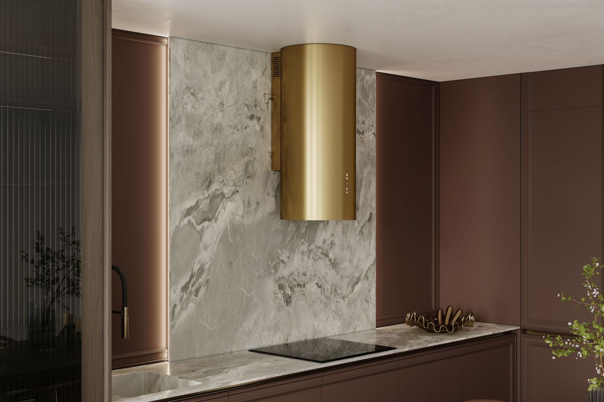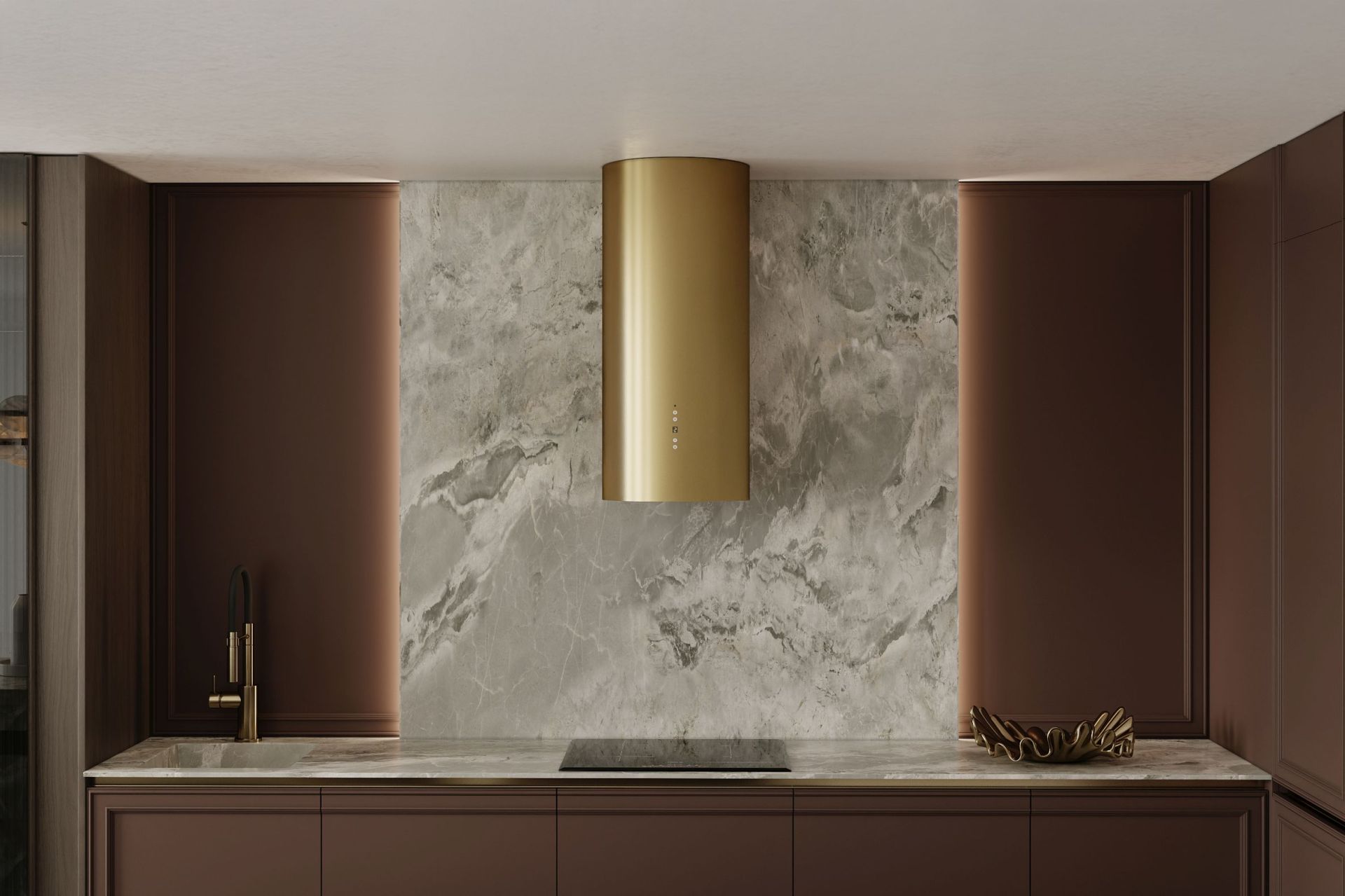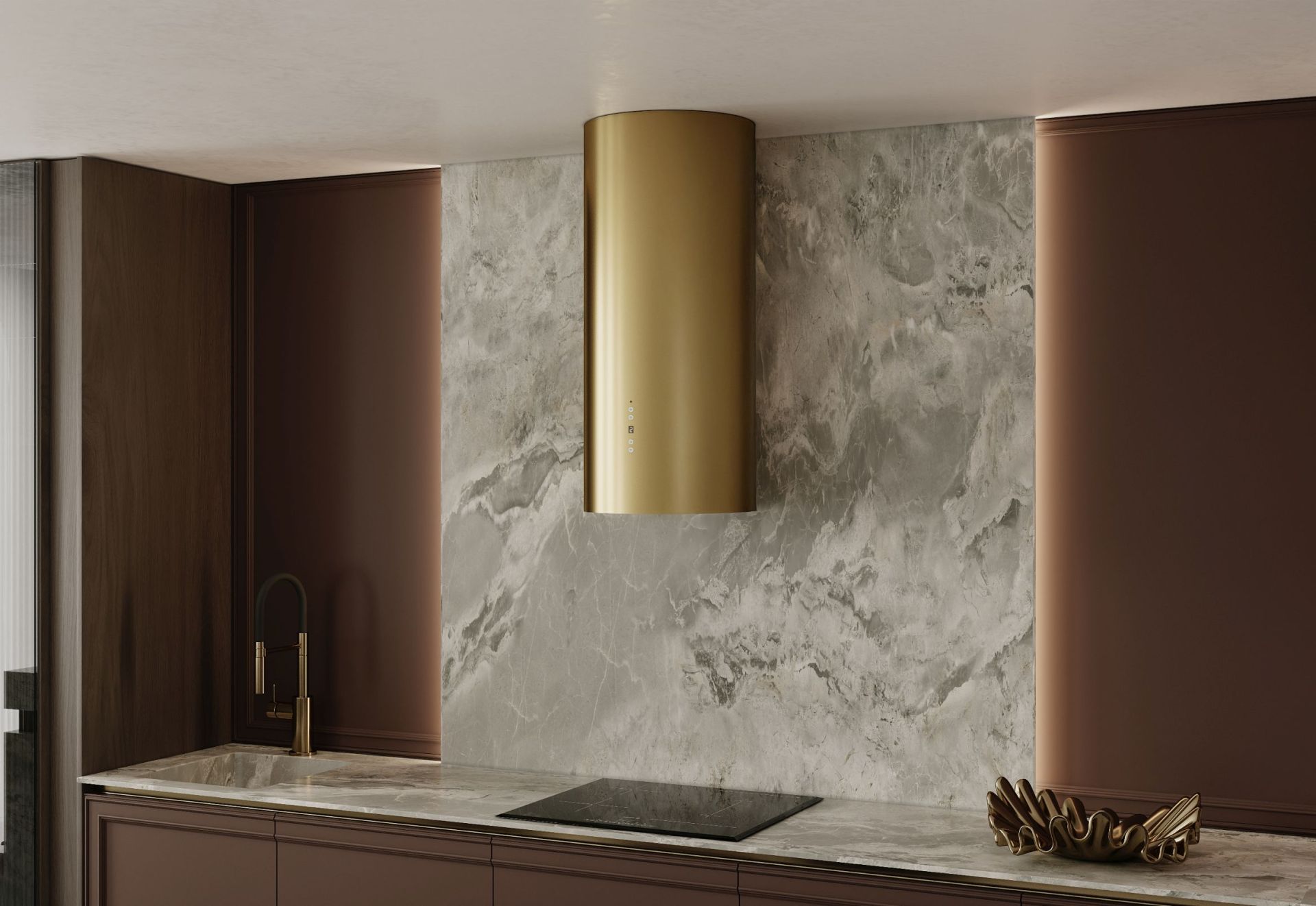 „W wyrafinowanej kuchni cylindryczny okap naścienny w kolorze złota unosi się jak rzeźba powietrza i światła, dyskretny, a jednocześnie dominujący.”
