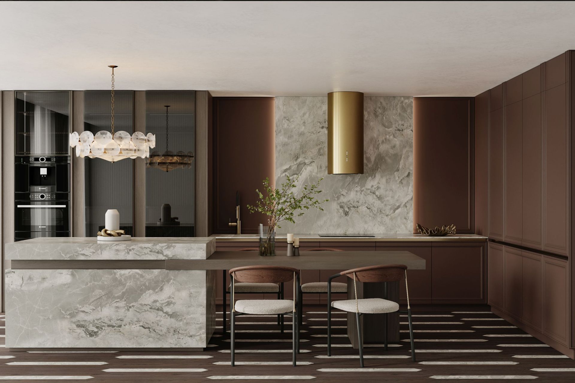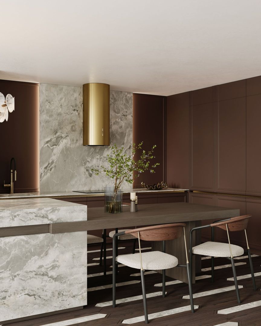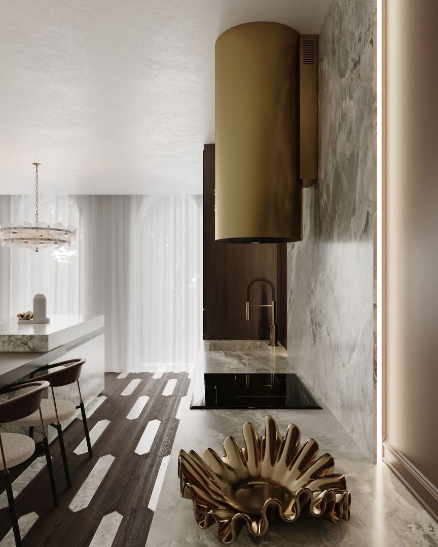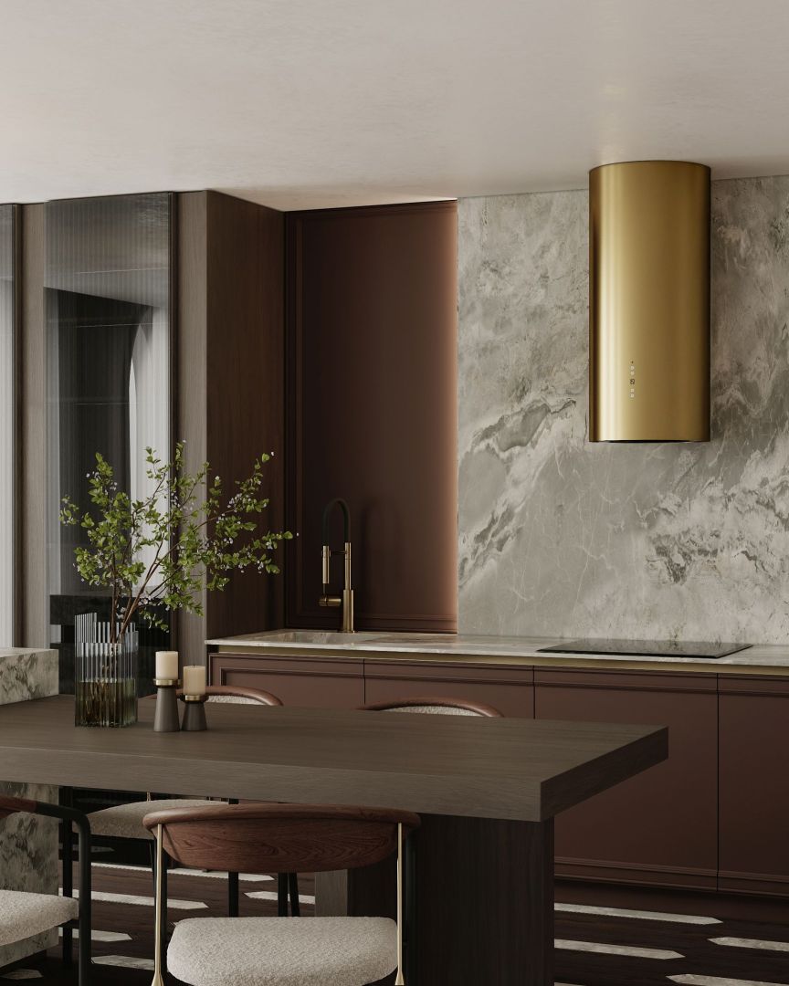 „W wyrafinowanej kuchni cylindryczny okap naścienny w kolorze złota unosi się jak rzeźba powietrza i światła, dyskretny, a jednocześnie dominujący.”