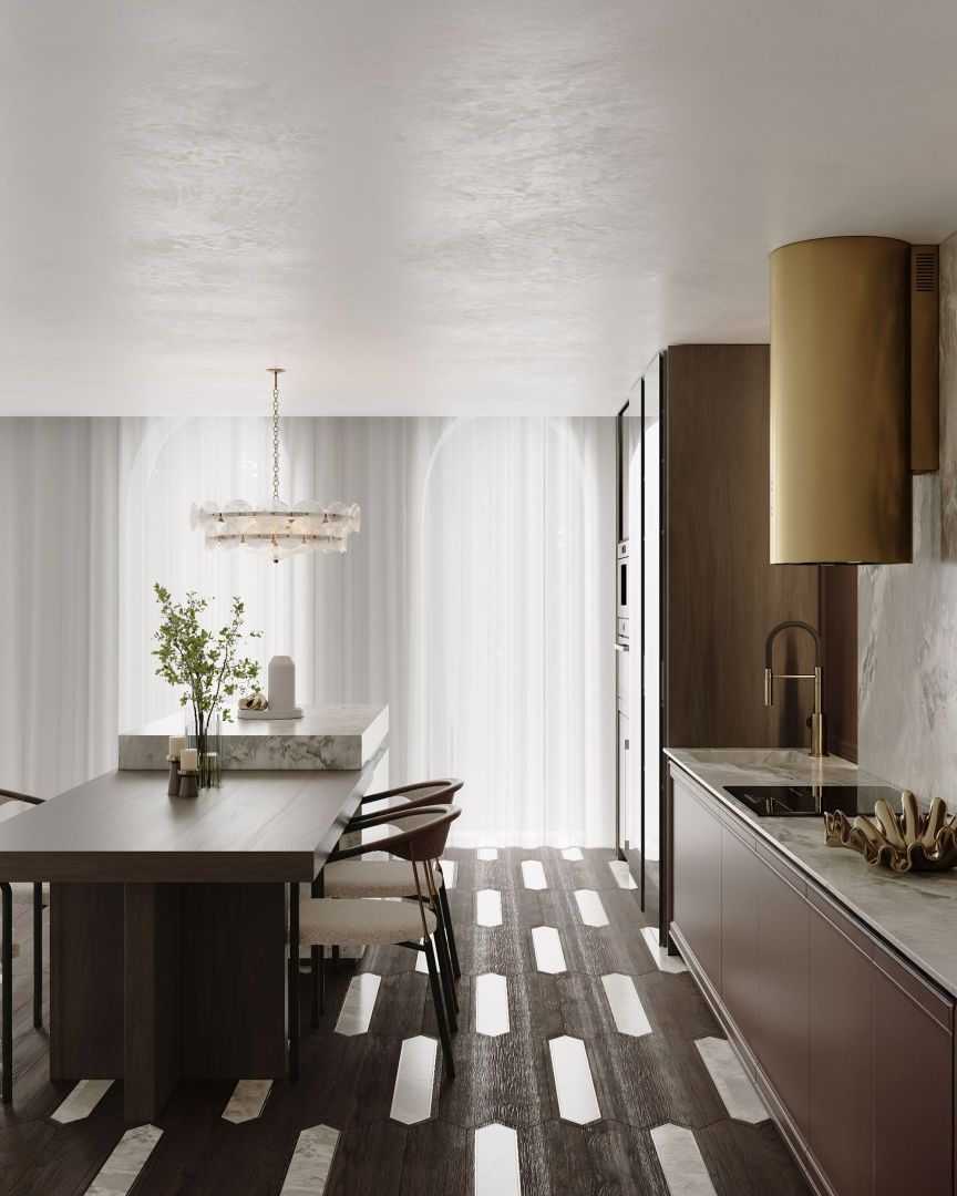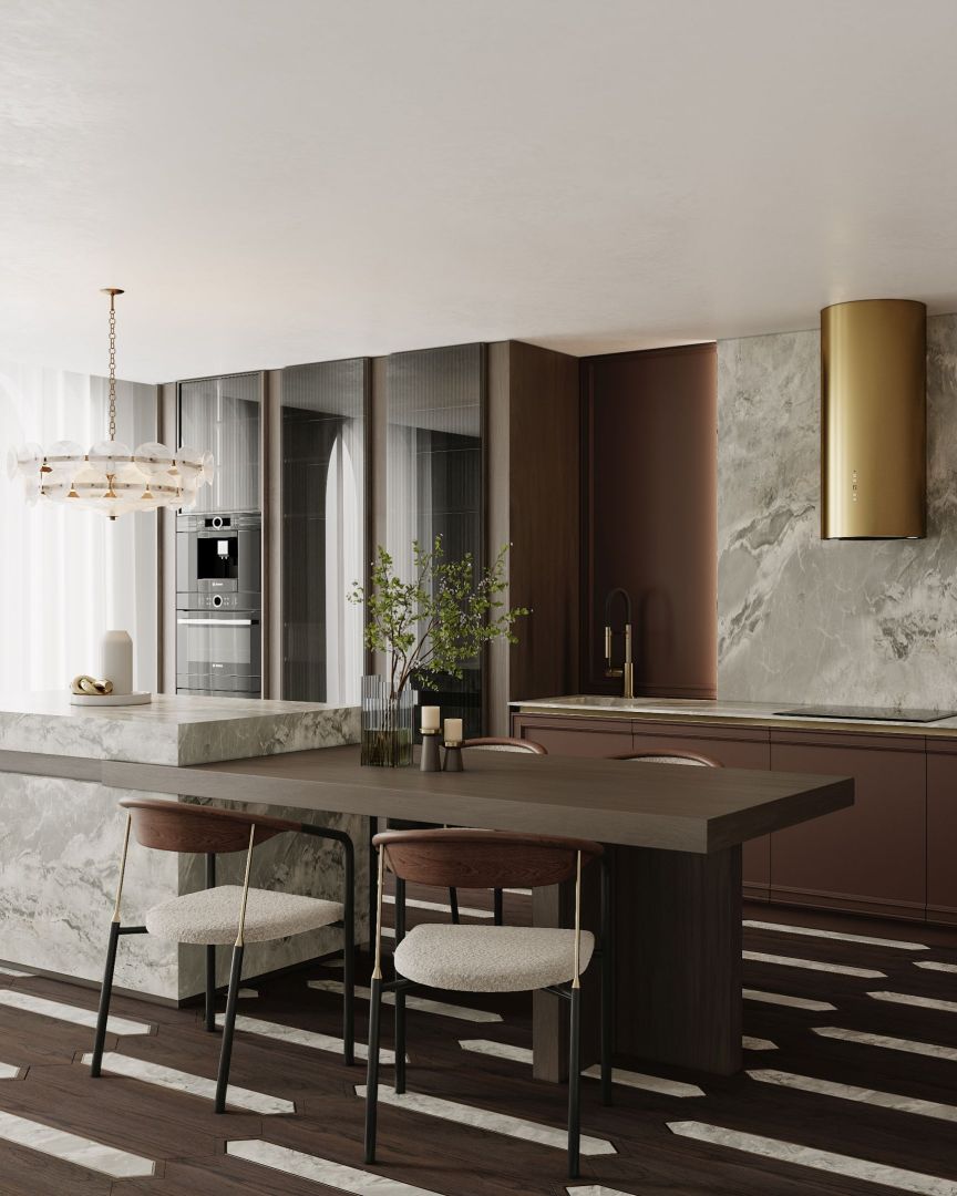 - Zestawienia z czernią, granatem, dębem/orzechem, marmurem/kwartzem (Calacatta, Nero), mosiądzem w uchwytach i bateriach.