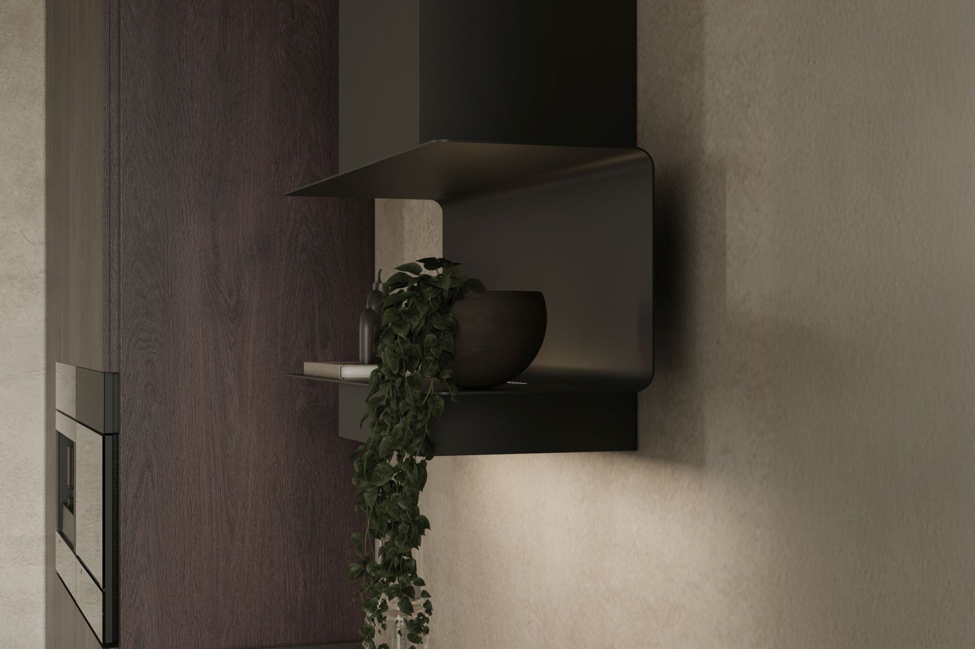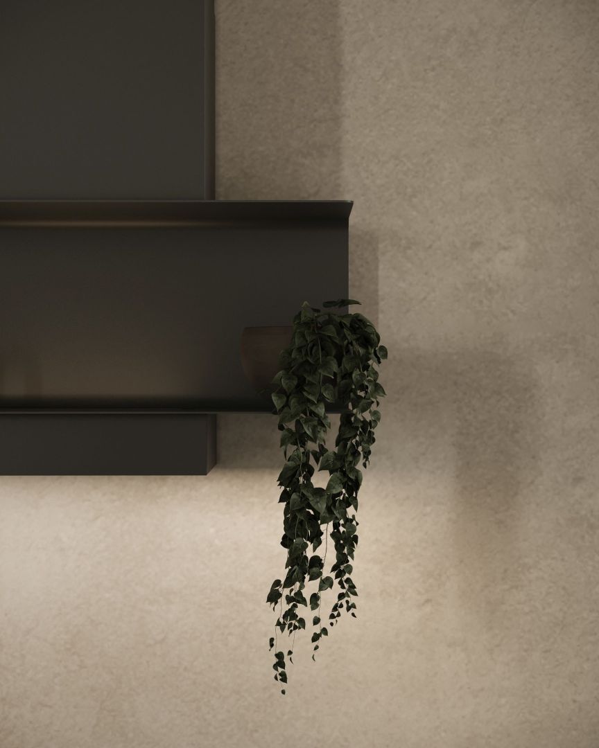 W całości utrzymany w głębokiej, matowej czerni, okap C-Shelf Czarno-Czarny tworzy efekt monolitycznej bryły stapiającej się ze ścianą. To czarny okap z półką w kształcie litery C, który podkreśla minimalistyczny charakter wnętrza, nie przytłaczając go.