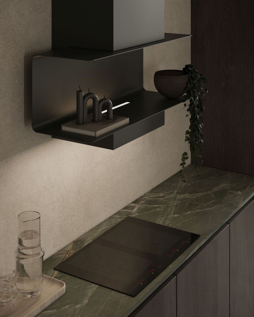 Zaprojektuj kuchnię, która inspiruje. Wybierz C-Shelf Czarno-Czarny – cichy okap ścienny z półką LED i silnikiem BLDC, który łączy design, technologię i ciszę.