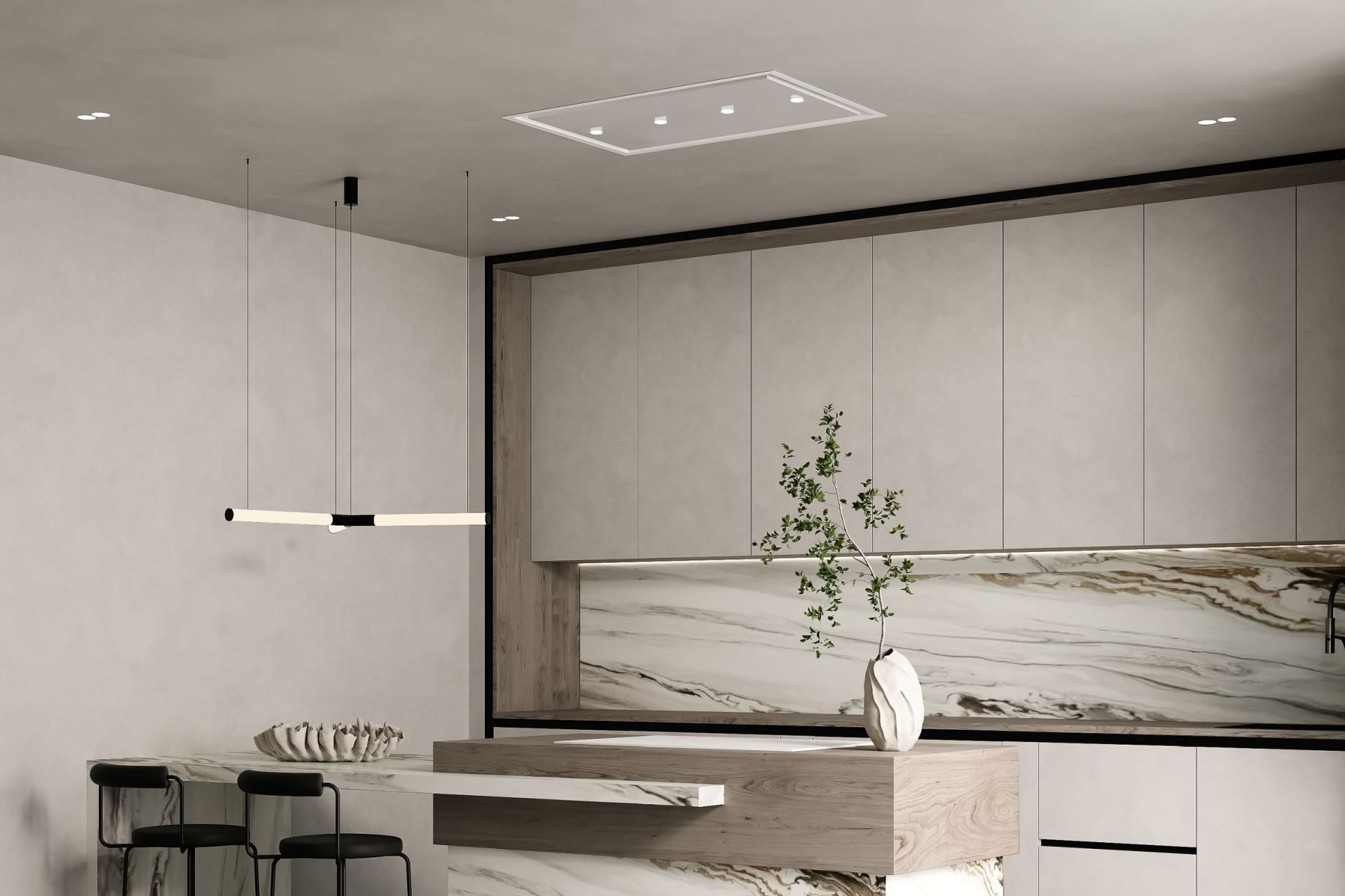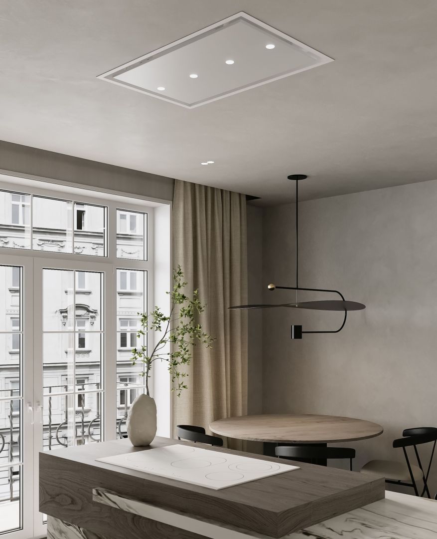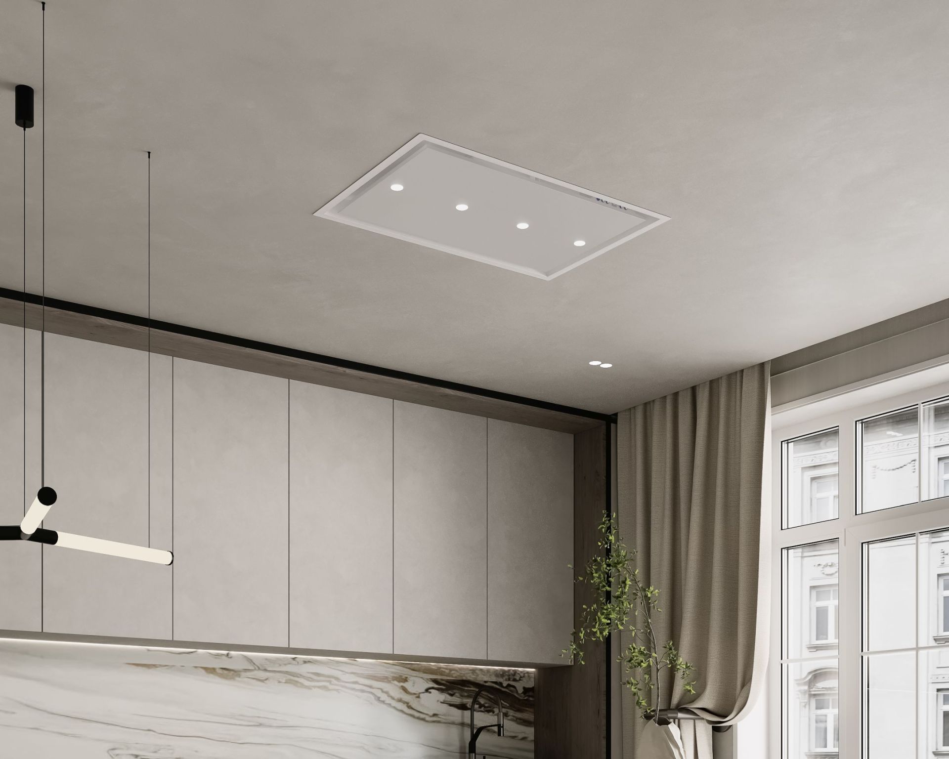 NAJCIEŃSZY OKAP SUFITOWY DOSTĘPNY NA RYNKU! Pięknie wpasowany w powierzchnię sufitową okap z doskonałymi parametrami technicznymi. Totalnie nowoczesny wzór, dekoracyjny w swoim minimalizmie. Wykonany z najwyższej jakości europejskich komponentów w kolorze czarnym bądź białym. Technologia pochłaniania obwodowego zapewnia maksymalną skuteczność, a przy tym dyskretną pracę urządzenia. Okap jest wyposażony w energooszczędne oświetlenie, symetrycznie rozmieszczone na środkowej klapie w postaci 4 wydajnych oczek LED. Dzięki swoim rozmiarom może być śmiało montowany w dużej odległości od płyty grzewczej, będzie w dalszym ciągu zapewniał fantastyczną wentylację. Dodatkowym atutem okapu jest sterowanie pilotem radiowym, który umożliwia obsługę urządzenia z każdego miejsca w pomieszczeniu.