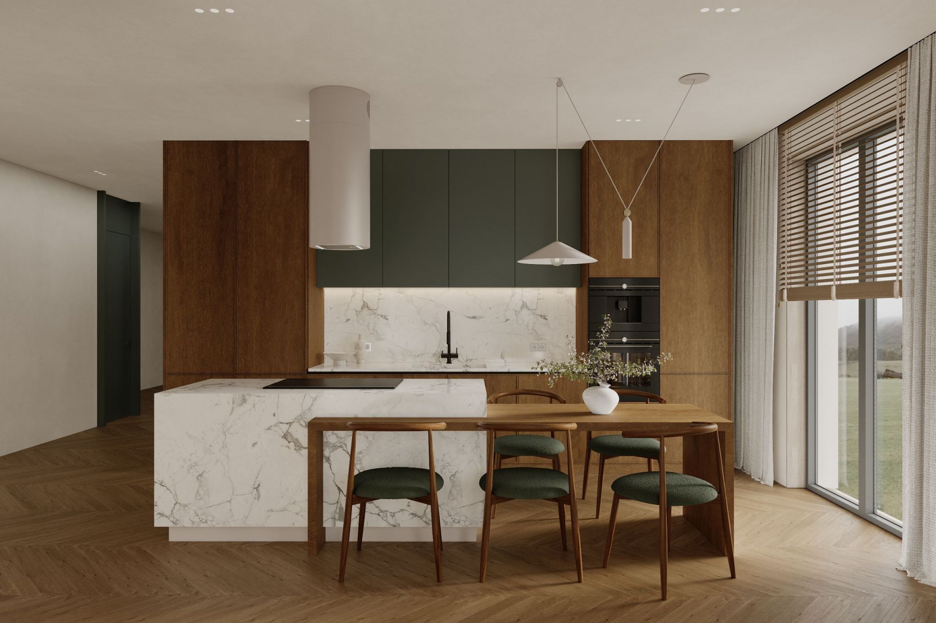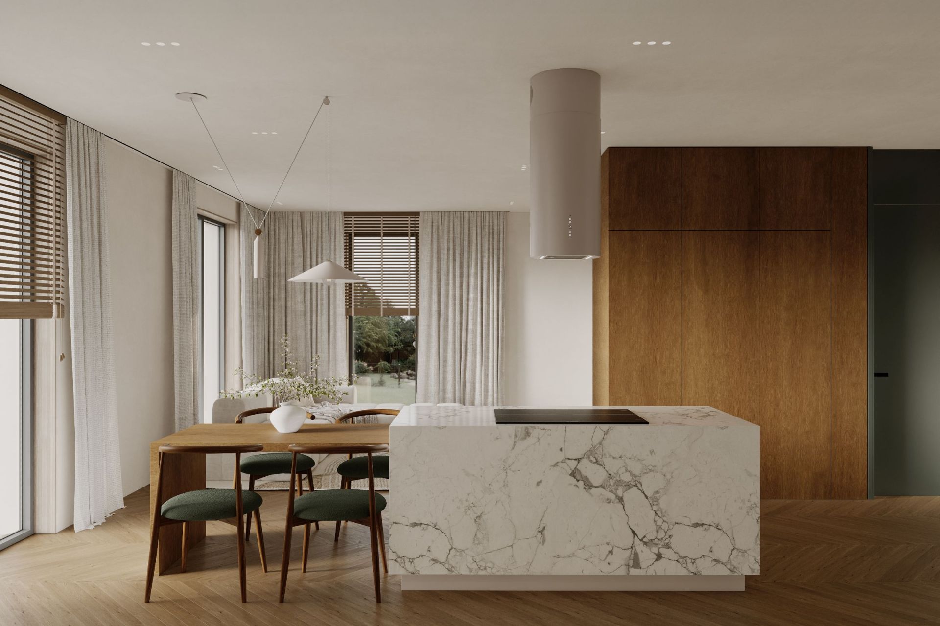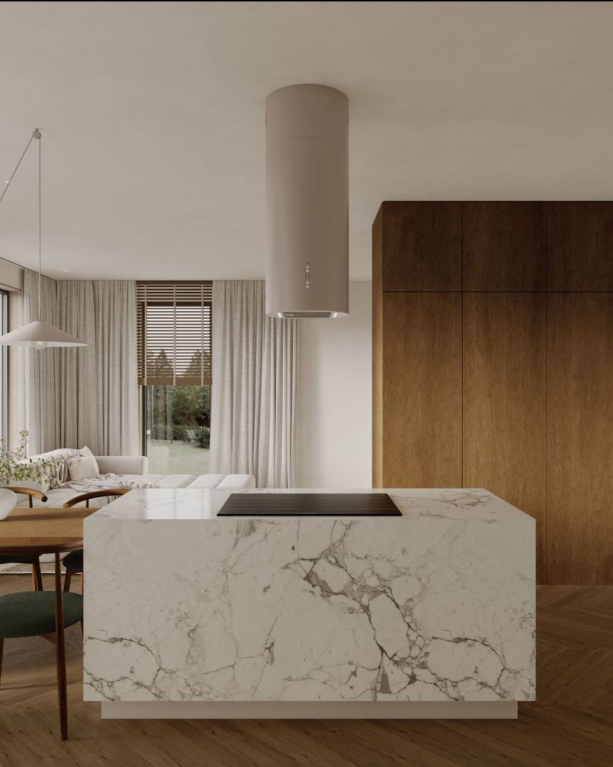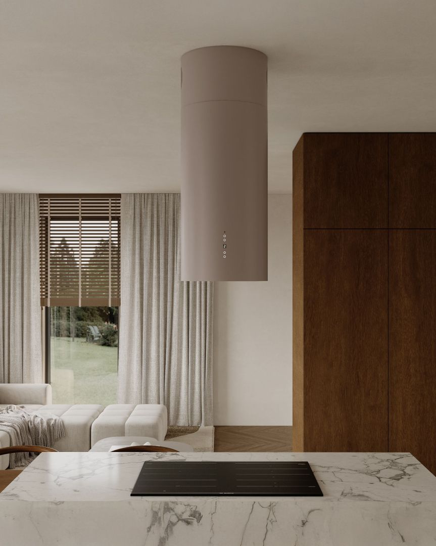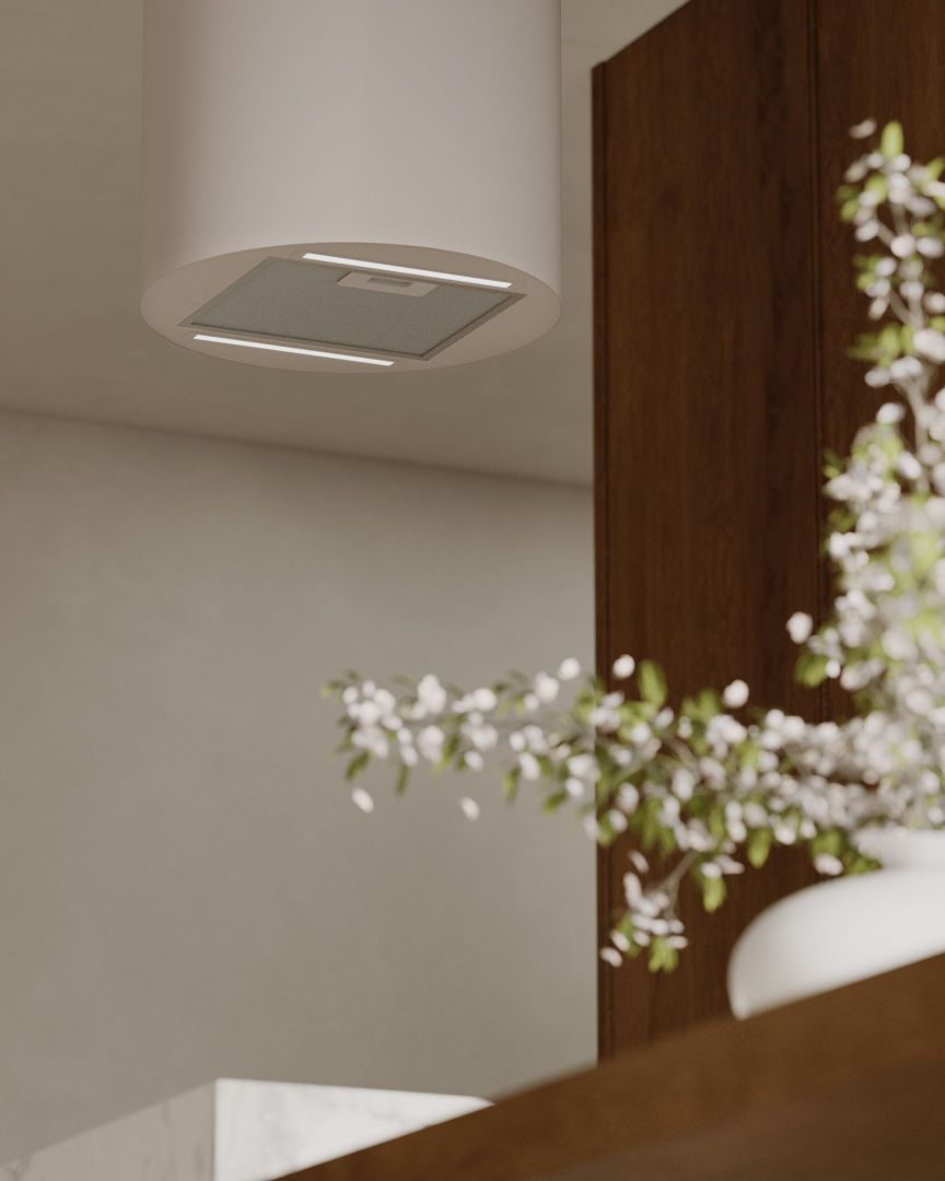 Cylindro 2Strips Kashmir to wyspowy okap kaszmirowy, który łączy apollińską cylindryczną formę, ultracichą turbinę BLDC (36 dB na I biegu) i energooszczędne paski LED 4000K, tworząc immersyjną przestrzeń kulinarnej elegancji. Kaszmirowe wykończenie perfekcyjnie współgra z laminatami Egger, drewnem, kamieniem i meblami premium, stając się niemal rzeźbą kuchennej wyspy.