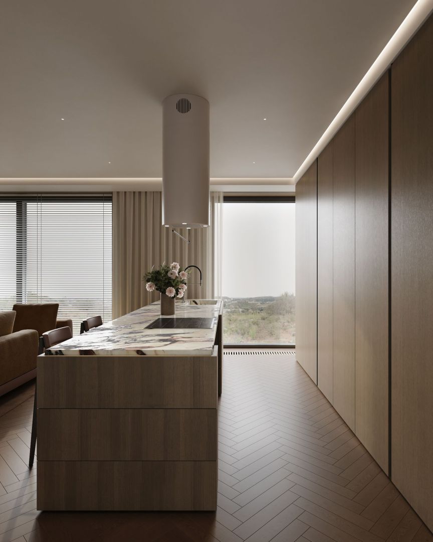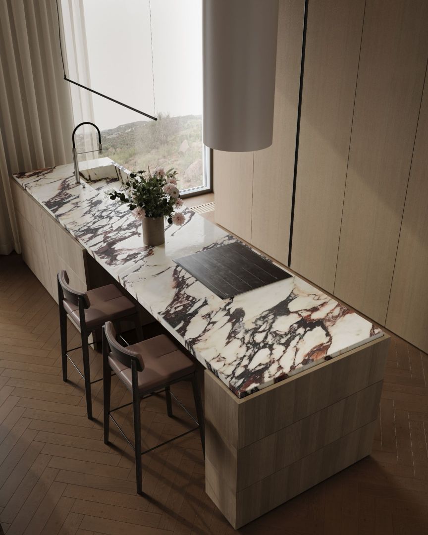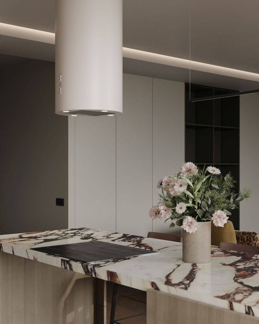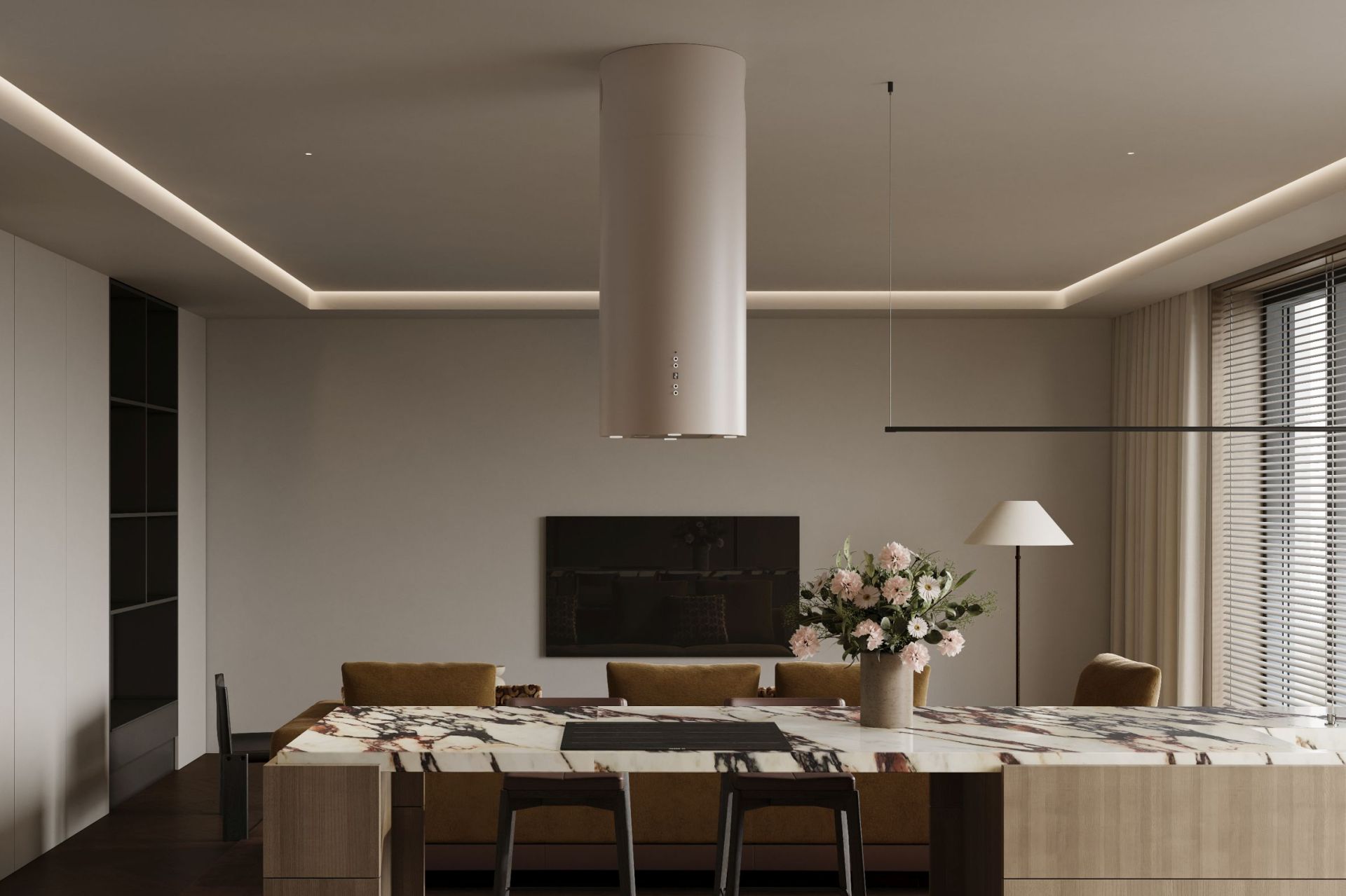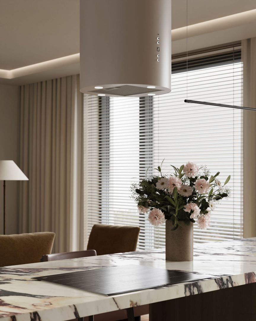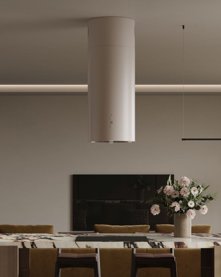 Zanurz się w atelier kuchni z Cylindro 4LED Kashmir – wyspowym okapem kaszmirowym, który łączy precyzyjne światło, niemal bezszelestną turbinę BLDC i luksusowy design.