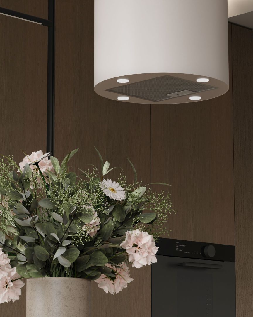 Cylindro 4LED Kashmir to wyspowy okap kaszmirowy, który łączy minimalistyczną cylindryczną formę, ultracichą turbinę BLDC (tylko 36 dB na I biegu) oraz cztery oczka LED 4000K, tworząc immersyjną, sensoryczną przestrzeń kulinarnej elegancji. Kaszmirowy odcień doskonale współgra z laminatami Egger, drewnem, kamieniem i elementami premium, stając się eleganckim, spójnym akcentem wyspy kuchennej.
