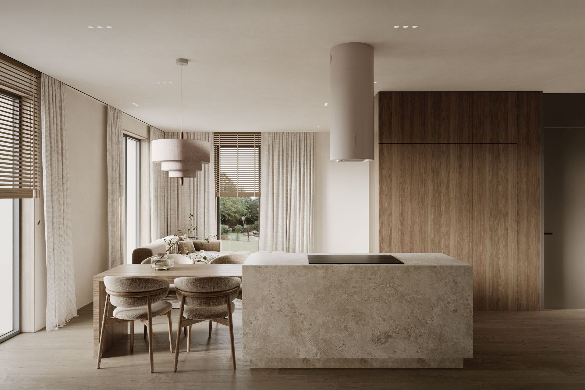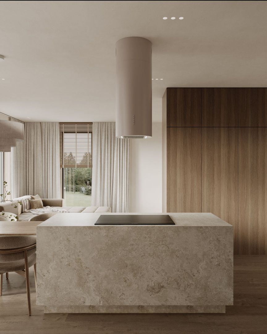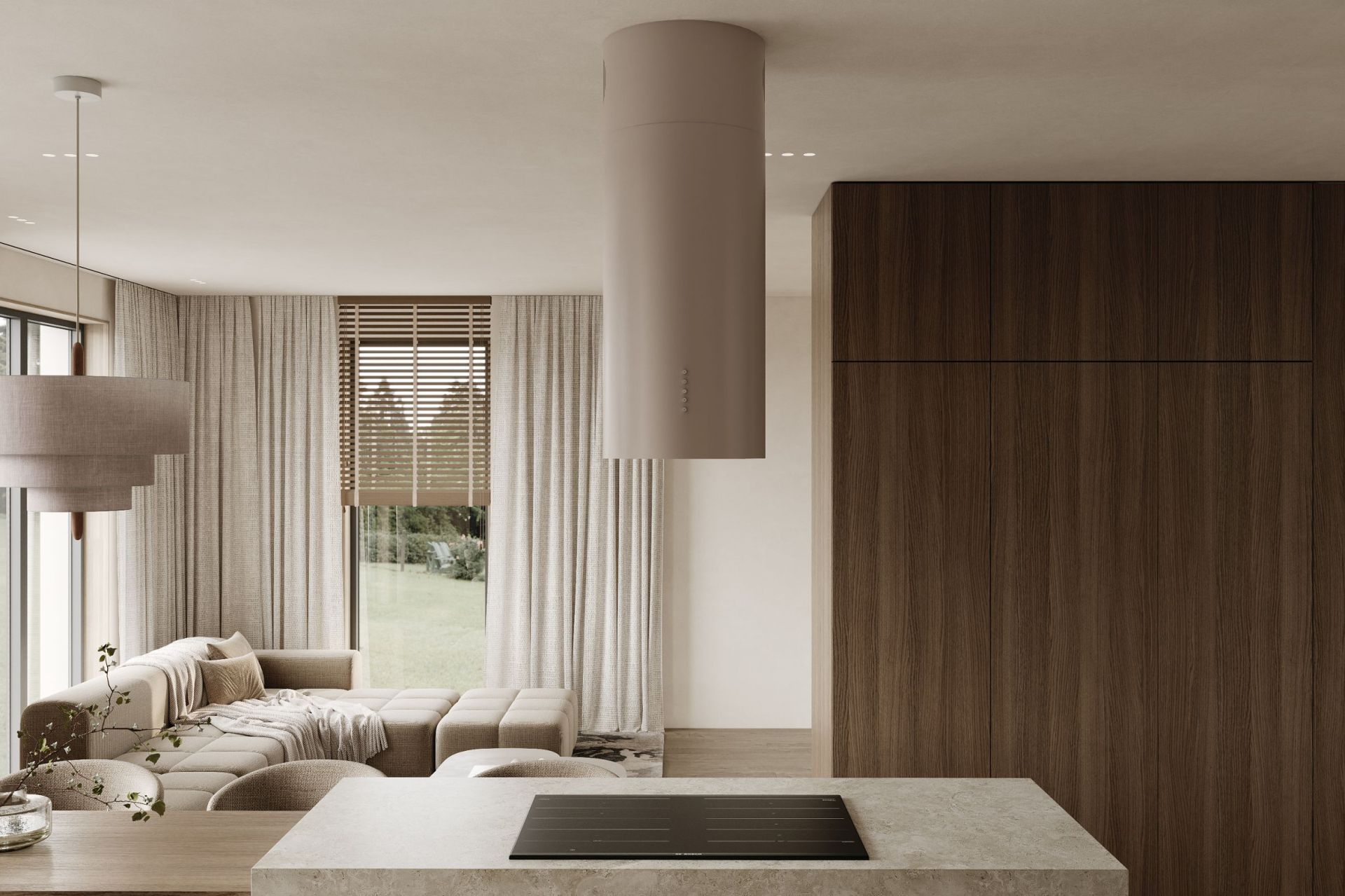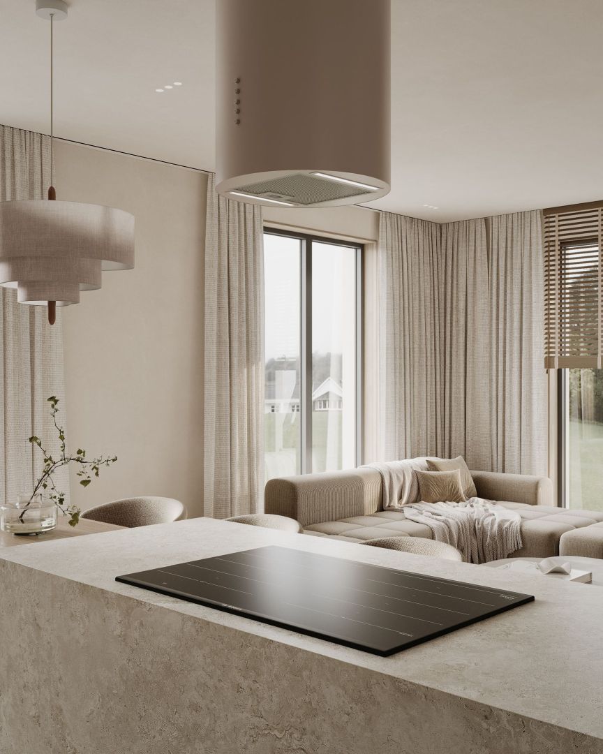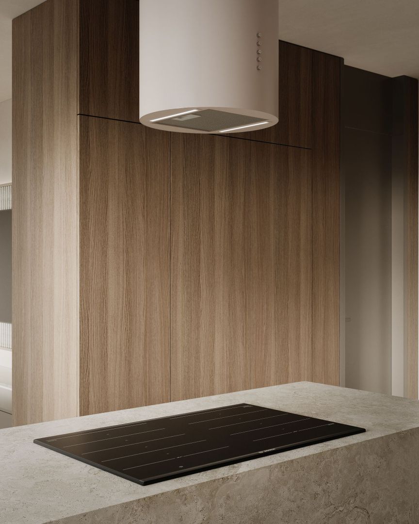 „Okapy cylindryczne zakotwiczają kuchnie otwarte, zapewniając zarówno punkt centralny, jak i przepływ powietrza, nie dominując przestrzeni.”