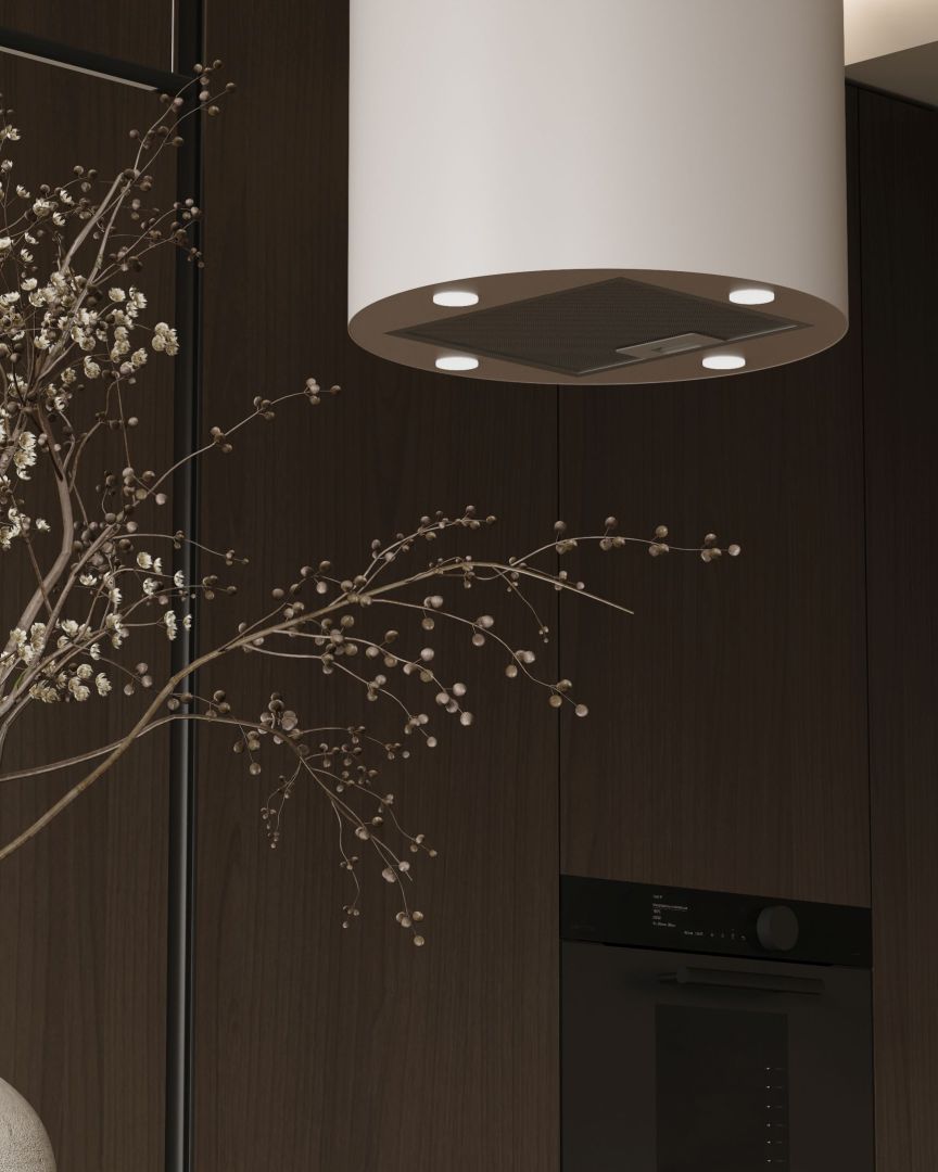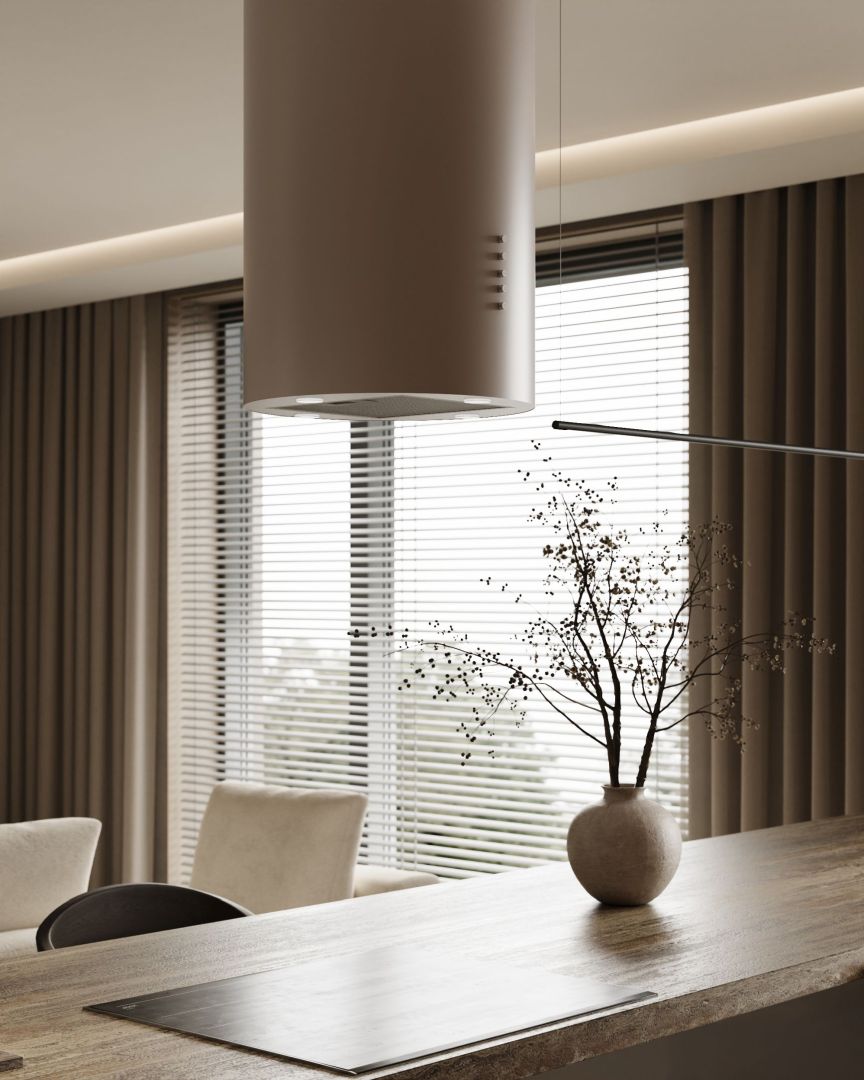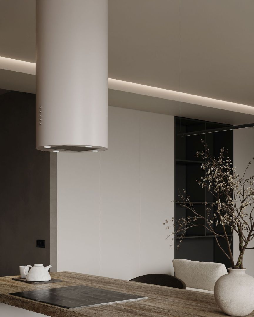 Cylindro Eco 4LED Kashmir to wyspowy, cylindryczny okap tubowy, który łączy skuteczne pochłanianie zapachów z profesjonalnym oświetleniem kuchni. Cztery oczka LED 4000K równomiernie oświetlają blat roboczy, tworząc atmosferę zbliżoną do atelier kulinarnego. Kaszmirowa tonacja (zbliżona do Écru / Beż / Ivory) harmonijnie współgra z laminatami Egger, drewnem i neutralnymi powierzchniami, nadając kuchni subtelną elegancję.