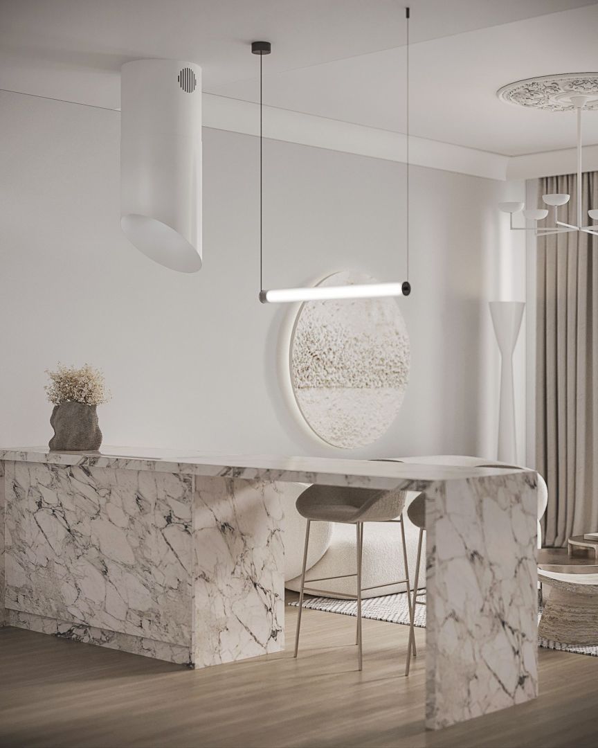 Biały tube wyspowy o tak wyjątkowym kształcie najlepiej zaprezentuje się w nowoczesnych przestrzeniach utrzymanych w stylistyce modern, new classic, scandic czy soft glam. Wybierz na wskroś elegancki i perfekcyjnie funkcjonalny model Hiro i ciesz się nim na co dzień.