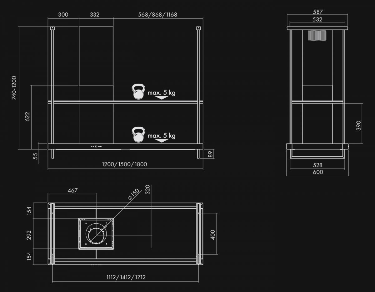 | Waga (150 cm): | okap 68,00 kg | okap z opakowaniem 74,80 kg |
