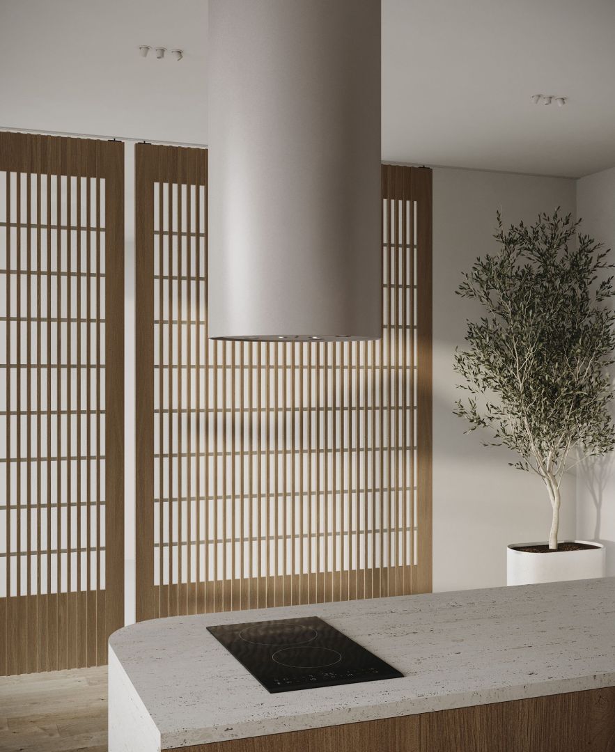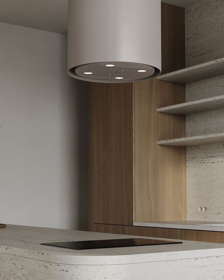 Tubo Kashmir Gesture Control to wyspowy okap premium, który łączy ultracichą turbinę BLDC (38 dB na I biegu), minimalistyczną tubę o średnicy 40 cm i sterowanie gestami. Neutralny odcień kaszmir doskonale komponuje się z frontami Egger Kashmir, naturalnym drewnem i szkłem, tworząc spójną, elegancką kuchnię.