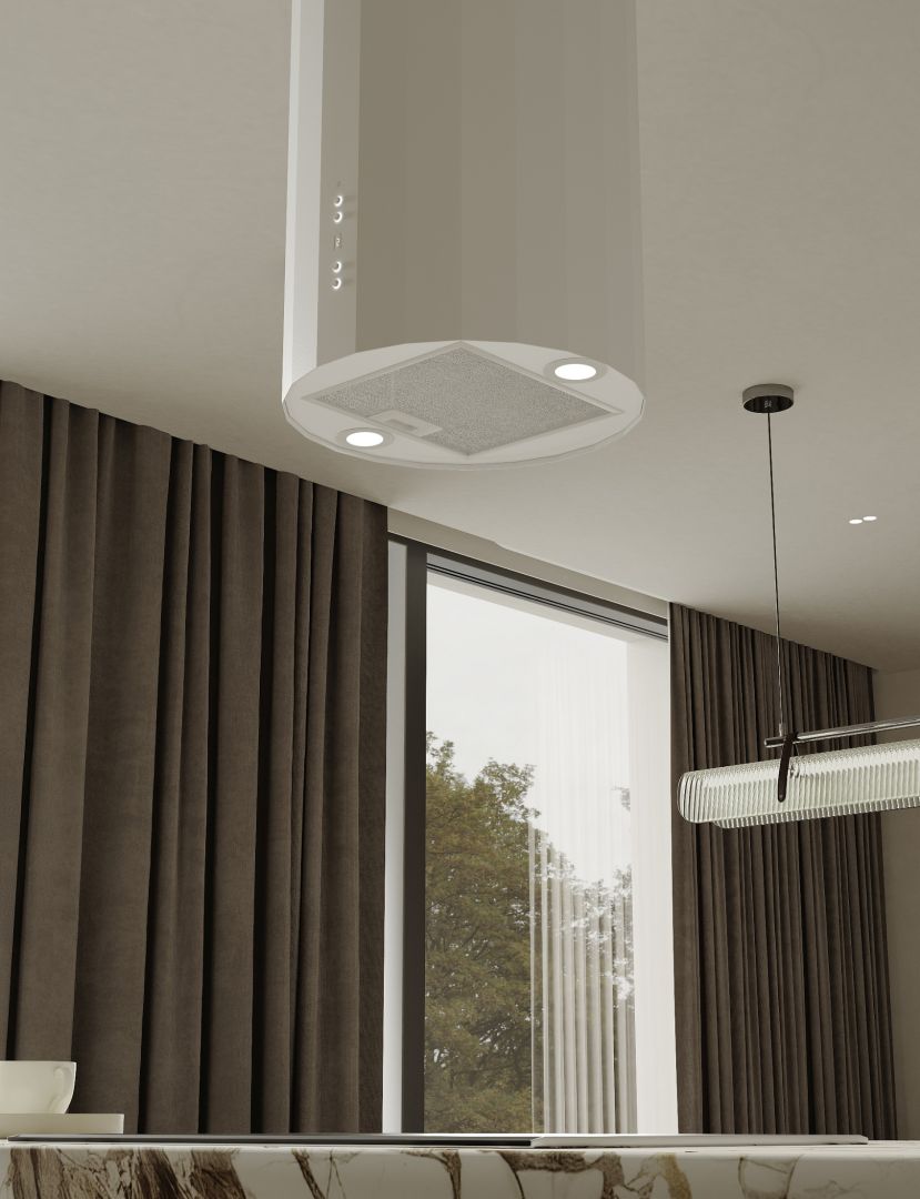 Okap kuchenny Nortberg Viva White Mat to wyspowy okap zapewniający skuteczną wentylację kuchni. Usuwa parę wodną, zapachy gotowania i tłuszcz znad płyty grzewczej, osiągając do 850 m³/h przy pracy od 36 dB. Jasna, matowa powierzchnia sprawia, że bryła staje się lekka i wizualnie neutralna.