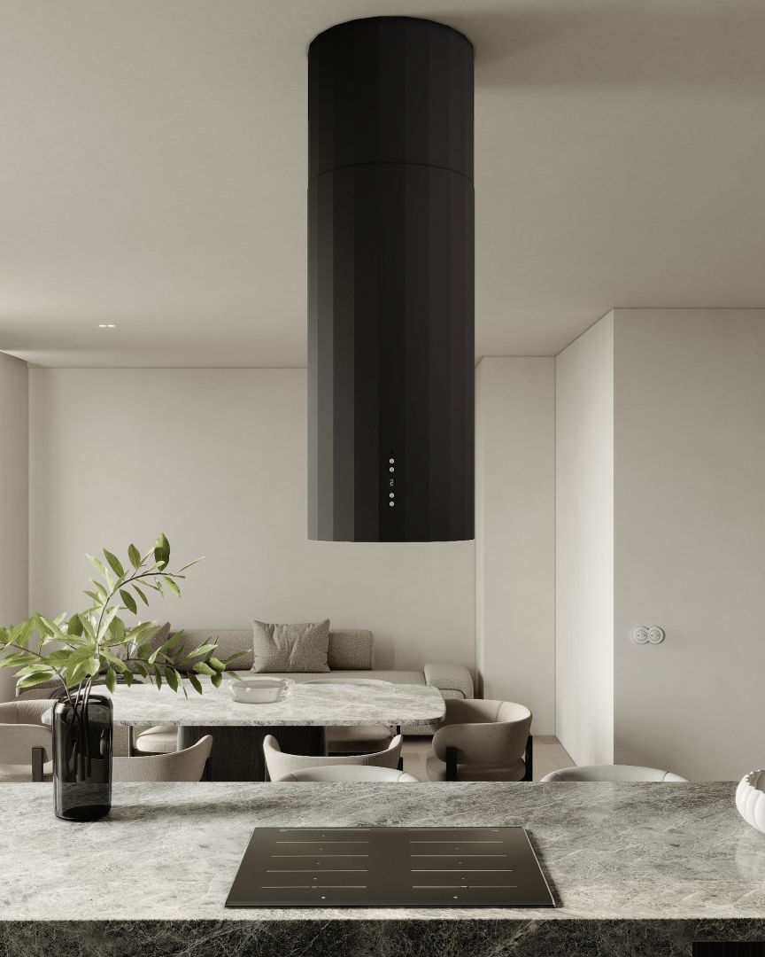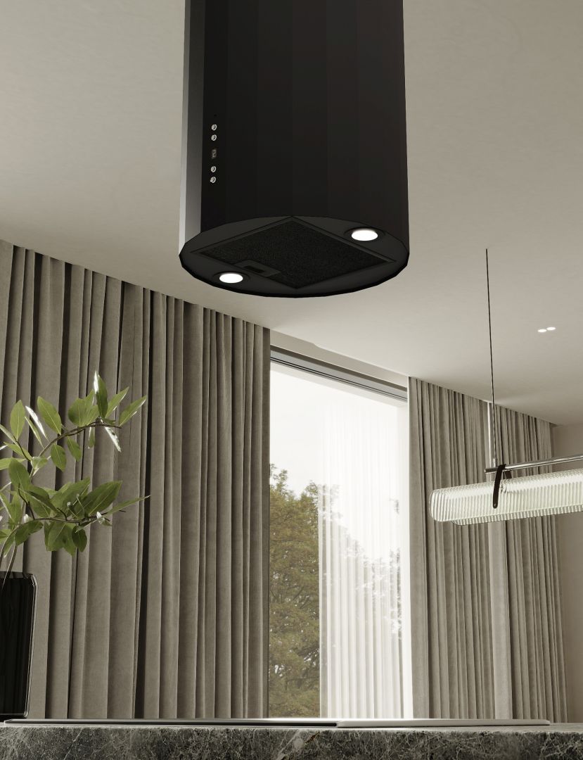 Okap Nortberg Viva w czarnym macie eksponuje swoją 22-boczną bryłę najmocniej.