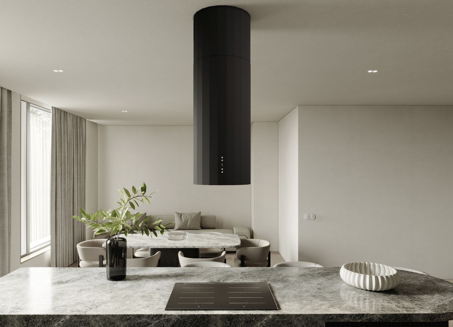 Okap kuchenny Nortberg Viva Black Matt to wyspowy okap zaprojektowany do skutecznej wentylacji kuchni nad wyspą. Usuwa parę wodną, zapachy gotowania i tłuszcz znad płyty grzewczej, osiągając wydajność do 850 m³/h przy cichej pracy od 36 dB. Kompaktowa forma 40 cm oraz głęboka, matowa czerń nadają wnętrzu wyraźny kierunek aranżacyjny.